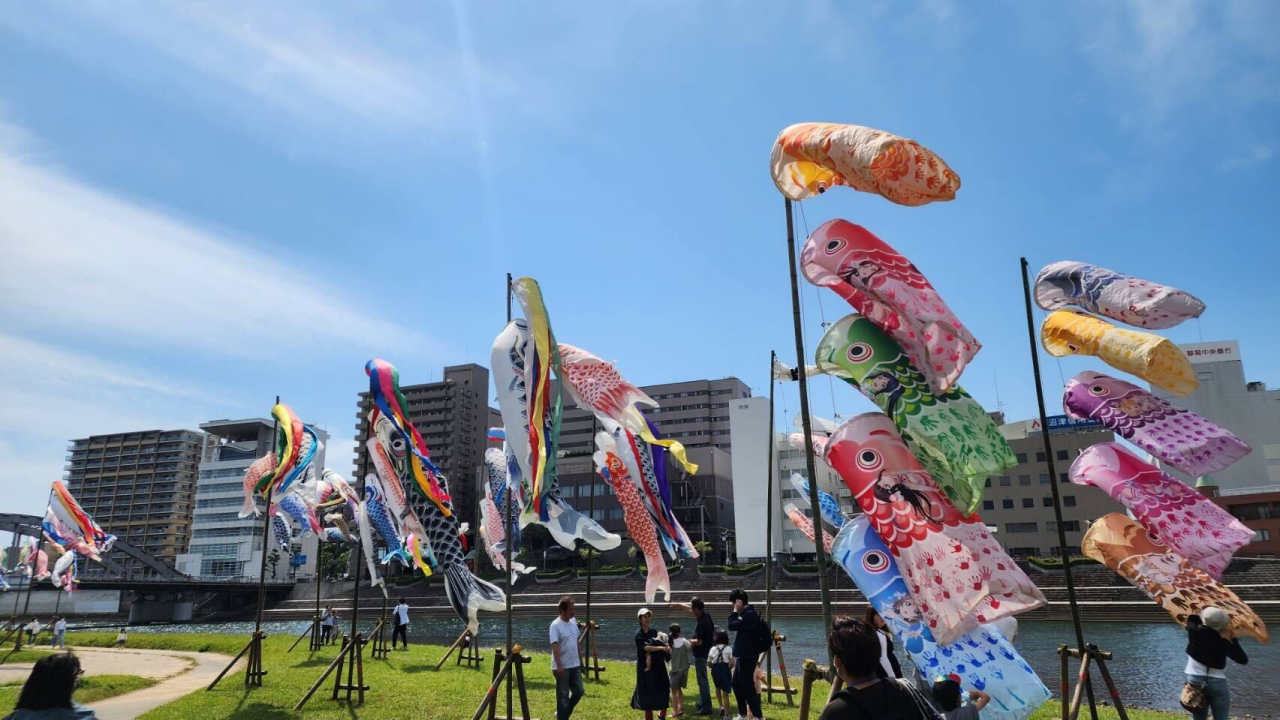 「こいのぼりフェスティバル」が行われ、たくさんのこいのぼりが空を泳(およ)ぎます。